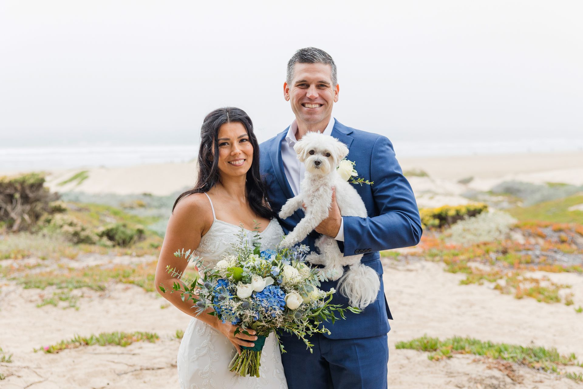 The bride was walked down the aisle by her daughter. The groom waited for them and their cute little dog was watching with rest of the guests. The couple's ceremony was up on the dunes, overlooking Pismo Beach. There was a tree lined aisle way and trees for a natural backdrop. The couple walked around the beach for more wedding pictures during their Pismo Beach small wedding.